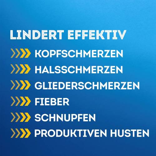 • GEZIELTE WIRKSTOFFE GEGEN ERKÄLTUNGSSYMPTOME: Paracetamol (Schmerzmittel) zur Linderung von Kopf-, Hals- und Gliederschmerzen sowie Fieber, Guaifenesin zur Schleimlösung bei produktivem Husten sowie Phenylephrinhydrochlorid, ein abschwellendes Mittel bei verstopfter Nase.