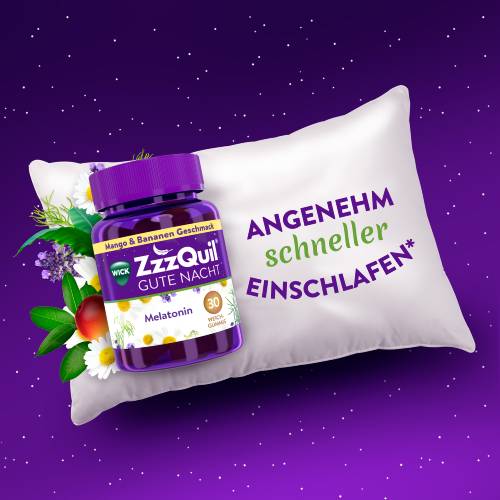 Das Leben ist besser, wenn man besser einschläft. Manchmal halten uns jedoch Sorgen des Tages abends vom Einschlafen ab. Wie es der Zufall will, scheinen die schlaflosen Nächte immer dann zu kommen, wenn man seine ganze Energie braucht, um den kommenden Tag zu bewältigen. Für solche Zeiten haben wir WICK ZzzQuil Gute NachtTM entwickelt, ein Nahrungsergänzungsmittel mit Melatonin, das Ihnen hilft, schneller einzuschlafen*, ohne dass Sie am nächsten Tag müde sind. Melatonin ist ein körpereigenes Hormon, es verursacht keinen Gewöhnungseffekt. Melatonin hilft, unseren Schlaf-Wach-Rhythmus zu regulieren.
